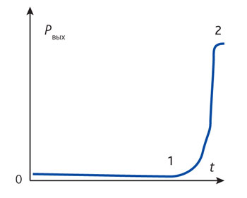 При эксплуатации самовсасывающих насосов необходимо учитывать низкий напор на выходе насоса в течение периода дегазации. На рис. 10 представлен график зависимости давления самовсасывающего насоса от времени. Период дегазации (отрезок от точки 0 до точки 1) сменяется периодом роста давления (от точки 1 до точки 2), когда жидкость начинает заполнять объем насоса. Далее, после точки 2, напор насоса стабилизируется.