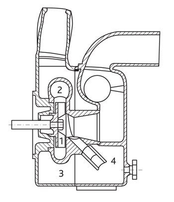 Рисунок 3. Самовсасывающий центробежный насос с портом рециркуляции на входе в рабочее колесо: 1 – рабочее колесо, 2 – рабочая камера, 3 – камера рециркуляции, 4 – порт рециркуляции |