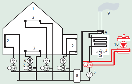 Рисунок 2. Схема теплоснабжения теплицы 1 – контур теплицы; 2 – отопительные контуры различных зон теплицы; 3 – газовый котел; 4 – экономайзер; 5 – насос контура котла; 6 – насосы отопительных контуров; 7 – регулирующие клапаны; 8 – гидравлическая стрелка; 9 – дымовая труба; 10 – тепловой насос «воздух-вода» |