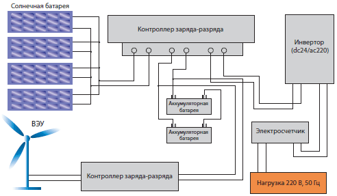 В состав комбинированной электростанции входит солнечная батарея (СБ), аккумуляторная батарея (стабилизационный блок), ветрогенератор, а также электронный блок, который содержит контроллер, следящий за работой батареи, зарядный блок и инвертор преобразования постоянного напряжения в переменное 220 В частотой 50 Гц (рис. 1). Если светит солнце или дует ветер, то происходит электропитание нагрузки и зарядка аккумуляторов, если ветер и солнце отсутствуют (ночью, во время штиля), то нагрузка питается от аккумулятора.