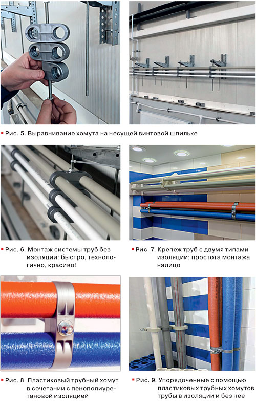 Крепление труб с помощью пластиковых трубных хомутов очень технологичное и простое: хомуты разделены на две половинки, которые стягиваются винтом после размещения в ячейках объекта крепления (труб). Поэтому основное внимание нужно уделить выравниванию расположения самого хомута на несущей винтовой шпильке, чтобы трубы в итоге были протянуты стройными рядами (рис. 5).