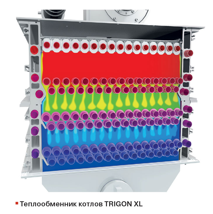 В средней части камеры сгорания установлены гладкие трубы – в этой зоне дымовые газы поддерживаются при температуре выше 600 °С достаточно долго, чтобы снизить неполноту сгорания и выбросы монооксида углерода CO. Благодаря этому максимальный уровень выбросов CO в котлах TRIGON XL равен всего 18 мг/кВт·ч.