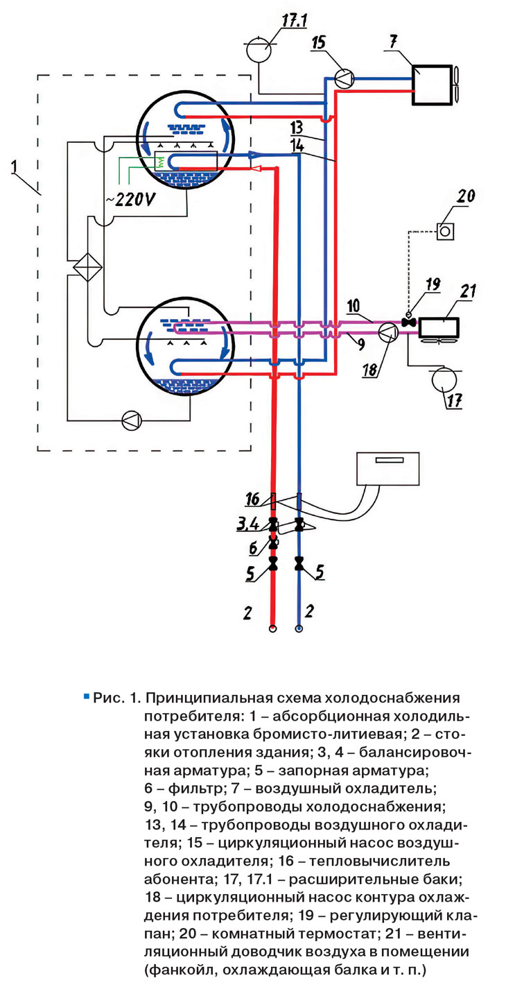 Решение, предлагаемое автором [1], позволяет расширить возможности когенерационной выработки энергоносителей фактически переходом к тригенерационной путем установки абсорбционной холодильной машины у потребителя с подключением генератора АБХМ к тепловым сетям здания, а именно к стоякам отопления или теплоснабжения. Таким образом, предлагается использовать схемное решение с применением АБХМ и воздушного охладителя, расположенного снаружи здания по типу децентрализованного использования. Это открывает некоторые новые возможности и обеспечивает ряд преимуществ: