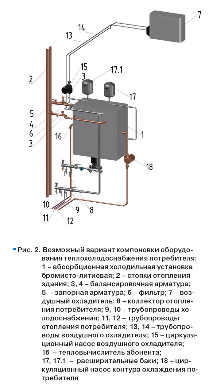 От АБХМ предусматриваются трубопроводы с циркуляционным насосом для размещения снаружи здания воздушного охладителя конденсатора и абсорбера. Внутренние потребители системы холодоснабжения могут быть выполнены в виде традиционных двухтрубных фанкойлов канального, настенного типов, а также охлаждаемых балок. Расширяются возможности применения приборов охлаждения в помещениях и использования их совместно с отоплением, вентиляцией и холодоснабжением (эжекционные доводчики).
