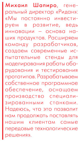 Локализация производства для «Ридан» – это не только сборка на российской территории, но и разработка, инженерные расчеты, учет нормативной базы и климатических условий регионов страны. Собственное RnD-подразделение состоит из отделов инжиниринга гидравлических компонентов, электронных комплектующих и программного обеспечения.