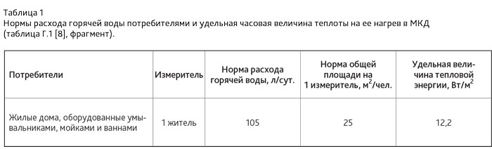 Численное значение удельной величины тепловой энергии (мощности) на подогрев горячей воды установлено СП 124.13330.2012 [8] и приведено в табл. 1.
