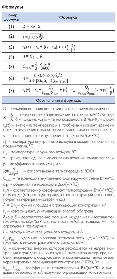При проведении практических вычислений для определения значения температуры tВ(τ) в требуемый момент времени после отключения подачи тепла в здание или помещение наиболее часто пользуются формулой (3), предложенной Е. Я. Соколовым в работе [2], и зависимостью В. Н. Богословского в [3], в которой вместо коэффициента β используется темп охлаждения α = 1/β. То есть коэффициент аккумуляции β (см. формулу (4)) и темп охлаждения a взаимосвязаны и характеризуют, хотя и с очевидными отличиями, тепловую инерционность. Теплоемкость С1/2,н с определяется половиной толщины δ, м, внутреннего слоя наружной стены – по формуле (5) [3].