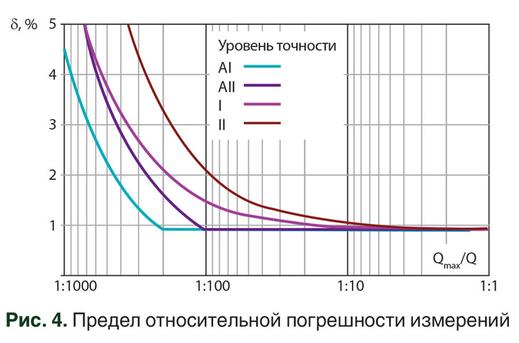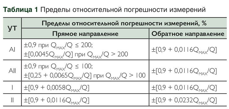 Погрешность преобразователей зависит от направления потока, уровня точности (УТ), верхнего предела измерений расхода QMAX (м3/ч) и измеряемого расхода Q (м3/ч). Значения пределов допускаемой относительной погрешности (рис. 4) преобразователей расхода ЛГК10 в рабочих условиях эксплуатации приведены в табл. 1.