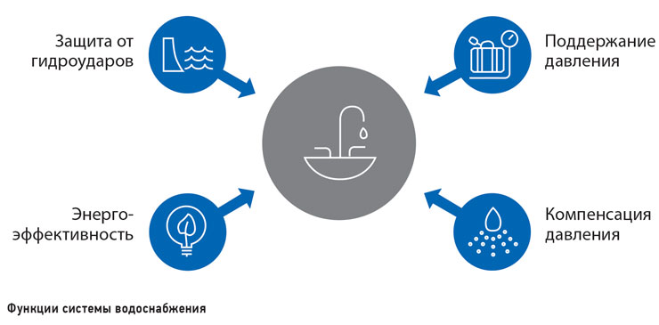 • поддержание стабильного напора и достаточного давления воды в водопроводной системе всего здания, особенно на верхних этажах, где естественный напор недостаточен;