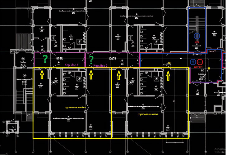 Проектирование систем противодымной вентиляции (ПДВ) детских садов имеет свои особенности, в частности связанные с планировкой. Так, групповые ячейки, расположенные выше второго этажа, должны выходить в два разных коридора. На планировках это отражается как нарезка из трех последовательных коридоров (см. рисунок).