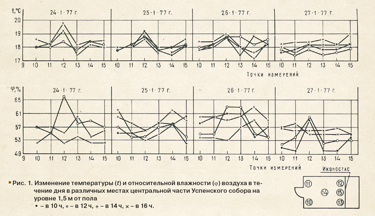 В центральной части каждого собора-музея определялись температура, относительная влажность и подвижность воздуха в различных точках на уровне 1,5 м от пола; температура и относительная влажность воздуха по высоте; температура, относительная влажность и скорость движения воздуха у приточных отверстий системы кондиционирования. Температура и относительная влажность воздуха на уровне 1,5 м от пола и у приточных отверстий измерялись психрометром Ассмана, а по высоте собора – с помощью медь-константановых термопар, прикрепленных к шарам-пилотам, наполненным гелием. Одна из термопар выполняла роль «мокрого» термометра, а другая – «сухого». Термопары подсоединялись к потенциометру ПП-63. Кроме того, производилась круглосуточная запись температуры воздуха по высоте собора с помощью гирлянды термопар, подвешенной к куполу. Подвижность воздуха определялась электротермоанемометром ЭА-2М.