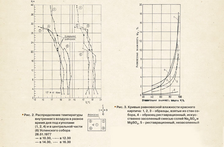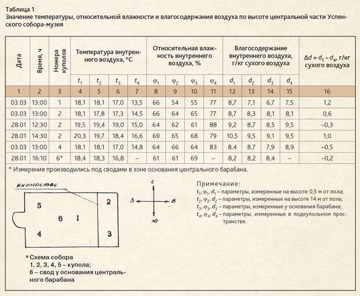 Исходя из архитектурно-планировочных особенностей, оказывающих влияние на формирование теплового режима, в каждом из соборов-музеев можно выделить три части: центральную (основной объем собора); отдельные изолированные помещения; барабаны и подкупольное пространство. Натурные наблюдения фактического температурно-влажностного режима проводились в каждой из указанных частей соборов-музеев в зимнее время.