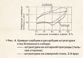 Таким образом, при определении оптимального температурно-влажностного режима помещений памятников искусства и архитектуры необходимо выбрать такие параметры его, при которых процессы разрушения, неизбежно происходящие по мере старения и эксплуатации памятников, минимальны. Из данных, полученных в результате исследования сорбционно-деформативных характеристик строительных материалов соборов-музеев, следует, что одним из путей ограничения интенсивности процессов разрушения материалов является сведение к минимуму деформаций материала. вызываемых поглощением влаги. Из анализа поведения кривых ε = f1(j) и ωр = f2(j) для материалов ограждающих конструкций соборов-музеев Московского Кремля (штукатурка, белый камень, красный кирпич) видно, что наиболее благоприятной с этой точки зрения является область 40 % < j < 67 %. Исходя из этого, следует рекомендовать поддерживать в помещении соборов-музеев относительную влажность внутреннего воздуха в указанных пределах.