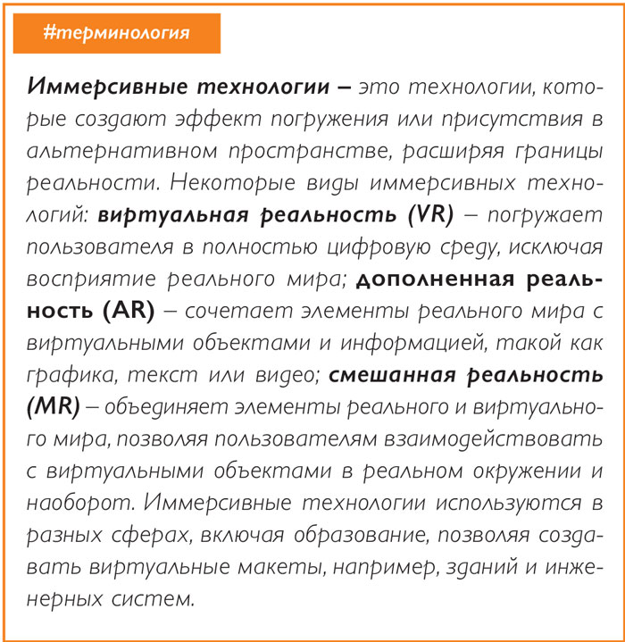 Совместное использование иммерсивных (VR, AR, MR) и BIM-технологий ускоряет процессы цифровой трансформации, улучшает качество архитектурных и конструктивных решений, снижает эксплуатационные риски.