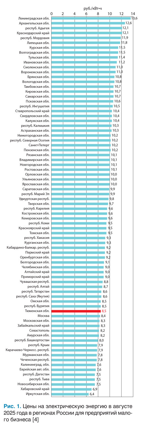 При сравнении цены на электрическую энергию, действующую в августе 2025 года для предприятий малого бизнеса в Тюменской области, с ценами, установленными для аналогичных предприятий в других регионах России, можно видеть (рис. 1), что Тюменская область (8,5 руб./кВт•ч без учета НДС) является одним из привлекательных для такой деятельности регионов. Если среднероссийский показатель составляет 9,6 руб./кВт•ч без учета НДС, то во многих регионах страны конечная цена превышает 11 руб./кВт•ч без учета НДС. Наиболее затратные в этом смысле регионы: Ленинградская область – 13,6 руб./кВт•ч, Архангельская область – 12,6 руб./кВт•ч, Краснодарский край – 12,1 руб./кВт•ч.