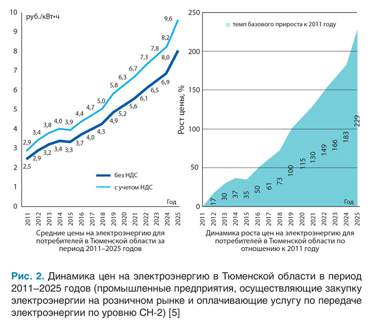 Несмотря на то, что Тюменская область является регионом с относительно дешевой стоимостью природного газа, потребляемого электростанциями, с 2011 года по настоящее время для категории средних и малых промышленных предприятий выявлен значительный рост цен. За период с 2011 по 2025 год прирост цен на электроэнергию составил 229 %. Иными словами, стоимость электроэнергии в Тюменской области за 14 лет выросла в 3,2 раза (с 2,5 до 8 руб./кВт•ч без учета НДС).
