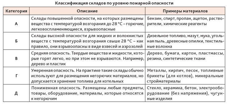 - характеристики складированных товаров – этот показатель определяет класс пожара;