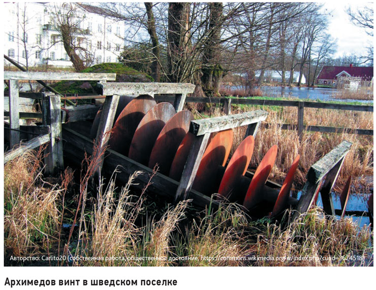 Тот же принцип можно увидеть в «пескалаторах» – архимедовых винтах, предназначенных для безопасного подъема рыбы из прудов. Архимедов винт также легко узнать в роли гребного винта водометного движителя.