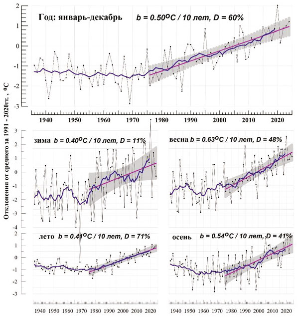 Рис. 1. Средние годовые (вверху) и сезонные аномалии температуры приземного воздуха (°С), осредненные по территории России, 1936–2024 годы [6]. Аномалии рассчитаны как отклонения от среднего за 1991–2020 годы. Показаны также 11-летнее скользящее среднее, линейный тренд за 1976–2024 годы с 95 %-ной доверительной полосой, b – коэффициент тренда (°С/10 лет), D (%) – вклад тренда в суммарную дисперсию