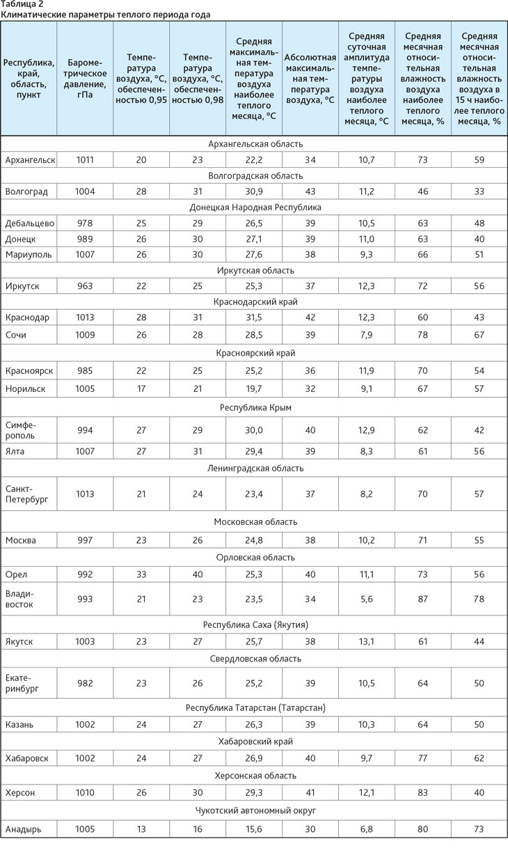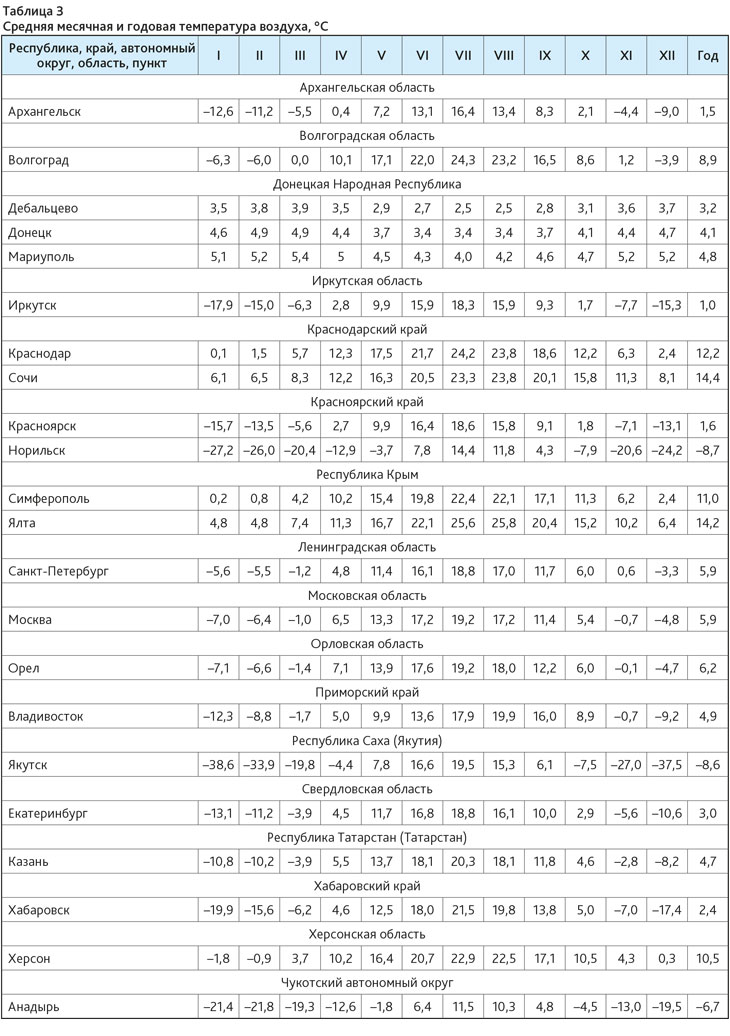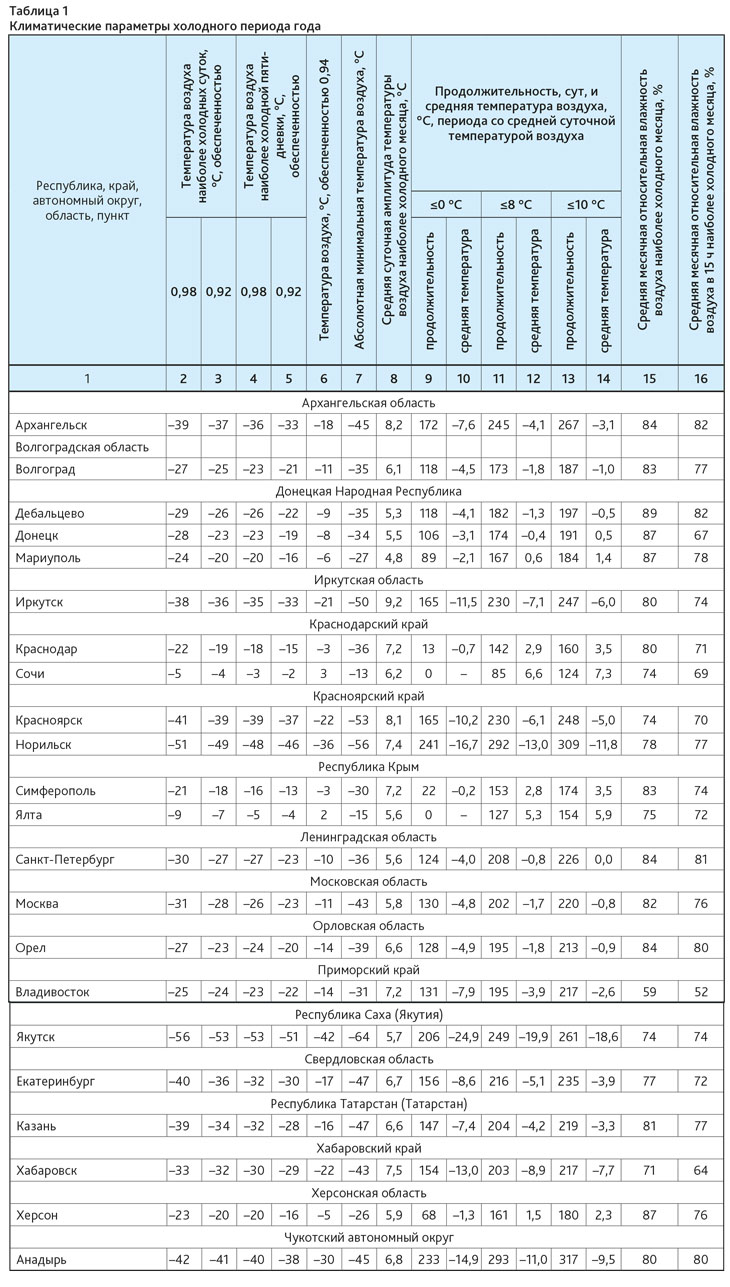 В табл. 1–3 приведены значения специализированных параметров для холодного периода года (табл. 1), для теплого периода года (табл. 2) и средние месячные и годовая температура воздуха (табл. 3) из пересмотренного документа.