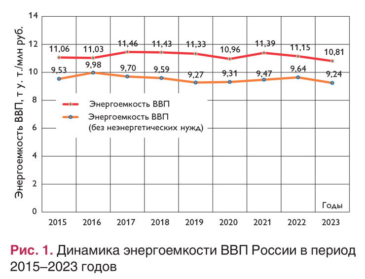 В Госдокладе-2023 отмечено, что энергоемкость российского ВВП (без учета неэнергетических нужд) в 2023 году составила 9,24 т у. т. на 1 млн руб. в ценах 2016 года, что на 3,2 % меньше показателя 2022 года. При этом среднегодовые темпы снижения энергоемкости ВВП (без неэнергетических нужд) в период 2015–2023 годов составили 0,34 % в год.