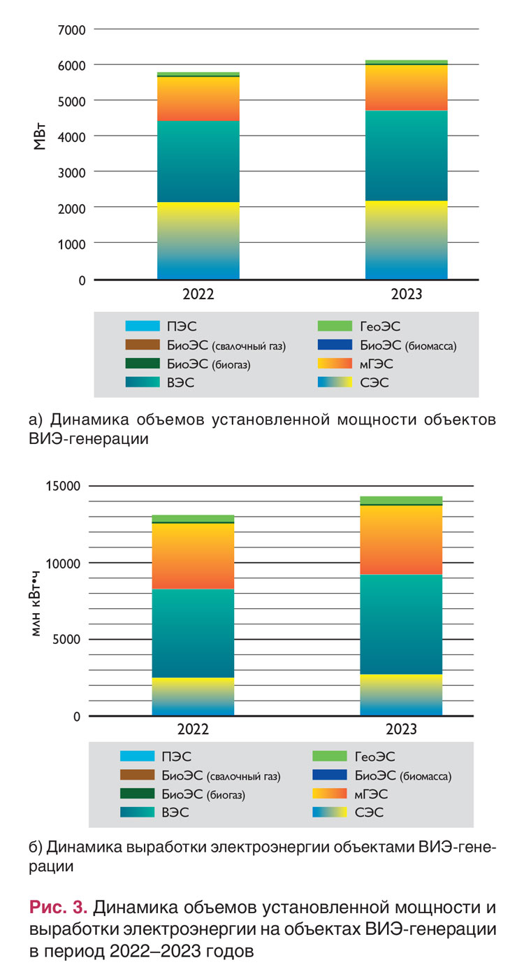 Только в Госдокладе-2023 появился раздел 2.1.5 «ВИЭ-генерация в России», в котором приводятся лишь самые общие данные об установленной мощности и выработке электроэнергии возобновляемыми источниками энергии в период 2022–2023 годов (рис. 3).
