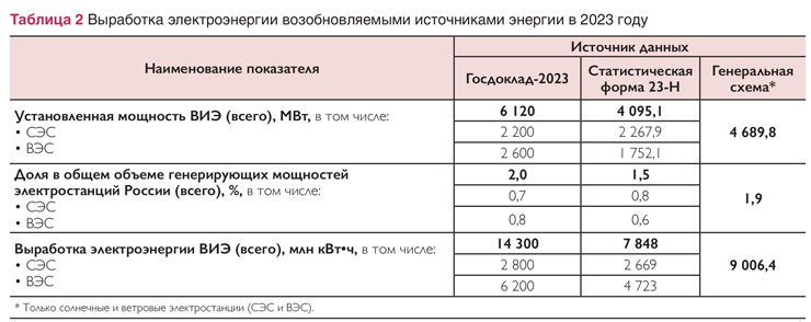 По данным, приведенным в этом Госдокладе, в 2023 году суммарная мощность ВИЭ составила 6 120 МВт, что составляет всего 2 % в структуре генерирующих мощностей электростанций России. При этом основную часть ВИЭ-генерации в России составляют солнечные и ветровые электростанции (СЭС и ВЭС). Общая установленная мощность СЭС (2 200 МВт) и ВЭС (2 600 МВт) в России равна 4 800 МВт. В то же время, согласно Госдокладу-2023, выработка электроэнергии возобновляемыми источниками энергии в 2023 году составила 14 300 млн. кВт•ч, что отличается от данных, приведенных в официальных источниках (табл. 2):
