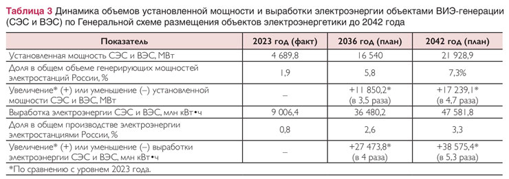 • к 2042 году мощность объектов ВИЭ-генерации должна возрасти более чем в 4 раза. Соответственно, доля возобновляемых источников энергии в структуре генерирующих мощностей электростанций России должна составить 7,3 %, а выработка электроэнергии СЭС и ВЭС – увеличиться в 5,3 раза.