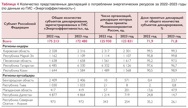 В Госдокладе-2022 и Госдокладе-2023 впервые появился раздел 3.4 «Декларирование потребления энергетических ресурсов». В этом разделе приводятся данные о представленных декларациях по потреблению энергетических ресурсов за период 2022–2023 годов по сведениям из ГИС «Энергоэффективность» как в целом по стране, так и по субъектам РФ. Выявлены регионы-лидеры и регионы-аутсайдеры по такому показателю, как доля представленных деклараций от общего количества субъектов декларирования (табл. 4). Но сразу возникает закономерный вопрос: насколько данные о представленных декларациях по потреблению энергетических ресурсов имеют прикладной характер и как их можно использовать на практике при повышении энергетической эффективности субъектов декларирования?