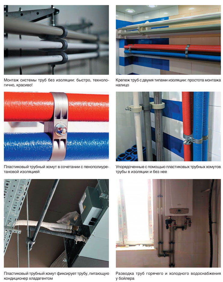 Компания «Мир Хомутов» разработала и предложила для изолированных труб горячего и холодного водоснабжения уникальное высокотехнологичное решение — пластиковые трубные крепления (одинарные и двойные), полностью лишенные недостатков металлических хомутов.