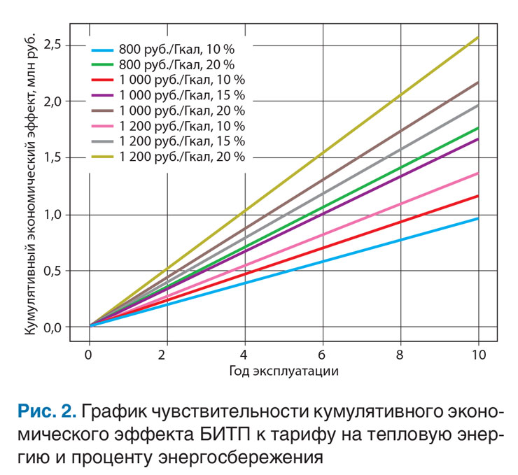 На графике (рис. 2) представлена зависимость кумулятивного экономического эффекта от внедрения БИТП с электромагнитными расходомерами в составе узла учета тепловой энергии от срока эксплуатации при варьировании двух ключевых параметров: тарифа на тепловую энергию и относительного снижения теплопотребления за счет автоматического регулирования. В качестве базового принят объект с теплопотреблением 1 000 Гкал/год. Рассмотрены три уровня тарифа – 800, 1 000 и 1 200 руб./Гкал, а также три сценария энергосбережения – 10, 15 и 20 %.
