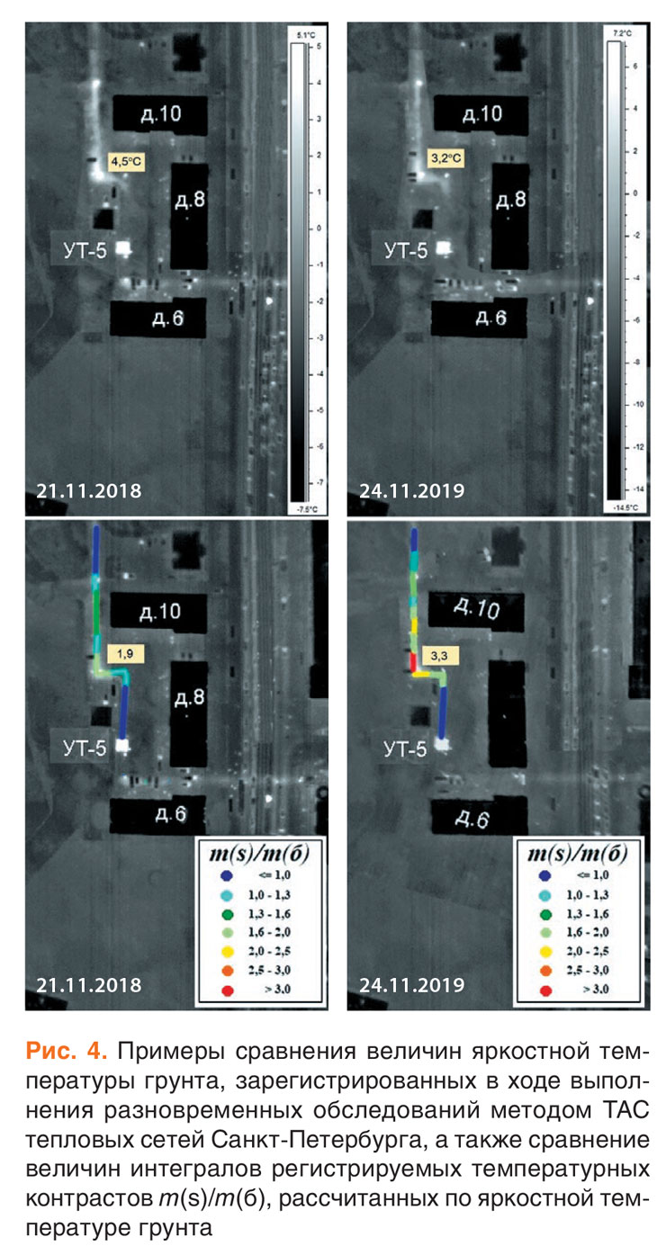 Примеры сравнения величин яркостной температуры грунта, зарегистрированных в ходе выполнения разновременных обследований методом ТАС тепловых сетей Санкт-Петербурга, а также сравнение расчетных значений регистрируемых величин интегралов температурных контрастов m(s)/m(б), рассчитанных по яркостной температуре грунта, показаны на рис. 4. Обследование методом ТАС выполнено 21 ноября 2018 года, а второе – 24 ноября 2019 года, при более низких температурах атмосферного воздуха. Сравнение изменения величин яркостных температур грунта в выявленной аномальной зоне (угол поворота теплотрассы) указывает на их отрицательную динамику: 4,5 °С в ноябре 2018 года против 3,2 °С в ноябре 2019 года.