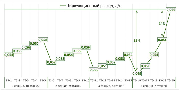 Общий циркуляционный расход воды распределяется по циркуляционным кольцам неравномерно. Чем дальше циркуляционное кольцо от ИТП, тем длиннее сеть и больше тепловых потерь, и следовательно, требуется бóльший циркуляционный расход для компенсации этих тепловых потерь.