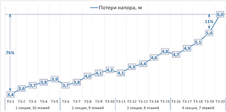 Зная циркуляционный расход воды через каждое циркуляционное кольцо, мы можем определить потери напора в этих кольцах. Чаще всего диктующим (имеющим максимальные потери напора) циркуляционным кольцом будет кольцо, наиболее удаленное от ИТП. К тому же в этом кольце нам необходимо обеспечить наибольший циркуляционный расход, т. е. потери напора в этом кольце будут еще больше.