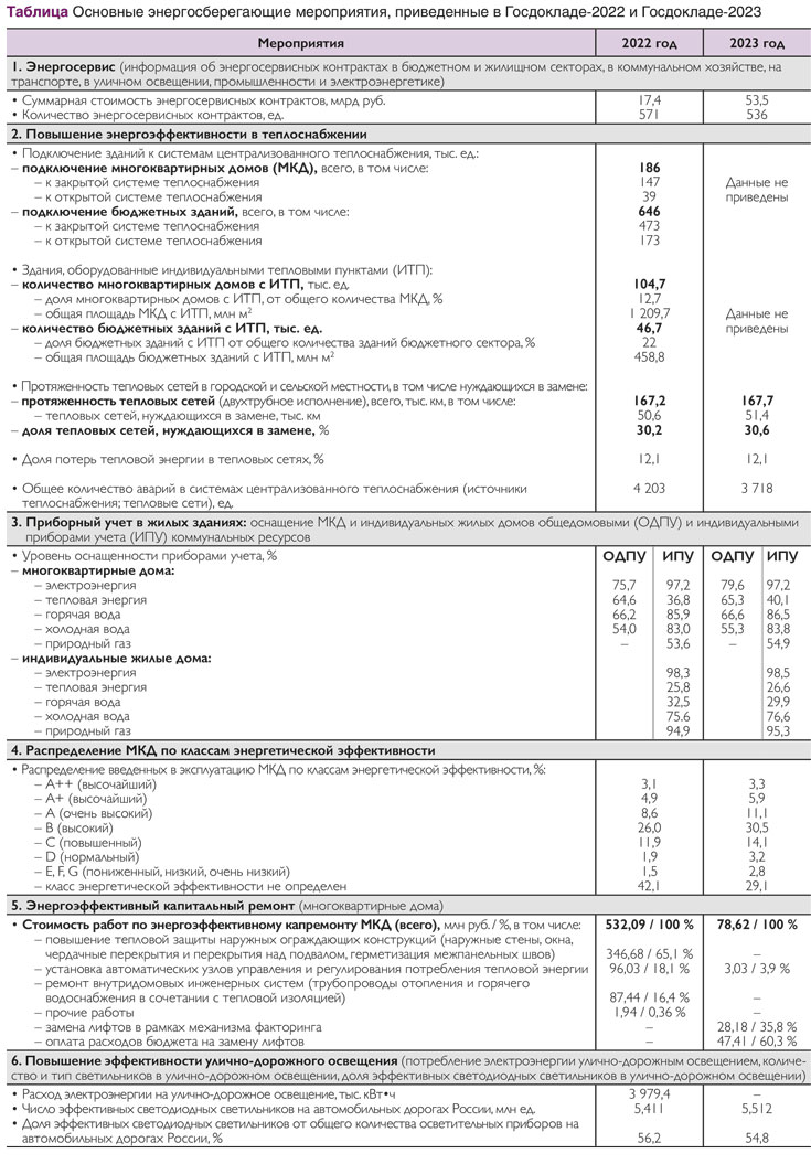 В Госдокладе-2022 и Госдокладе-2023 приводятся данные по тому же набору основных мероприятий в России, что и в прошлых ежегодных Госдокладах (см. табл.), – и ничего сверх этого. Соответственно, создается такое впечатление, что в России мероприятия и технологии в области энергосбережения и повышения энергетической эффективности возможно реализовать только в жилых и бюджетных зданиях, в системах теплоснабжения и в улично-дорожном освещении. А остальные сектора экономики России почему-то выпали из поля зрения ежегодных Госдокладов. В частности, не рассматриваются мероприятия и оценка повышения энергоэффективности: