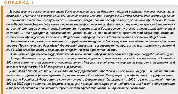 Отметим, что в сводном заключении комитета Государственной думы по бюджету и налогам рекомендуется Правительству РФ отозвать Госпрограмму и принять меры для приведения ее в надлежащее состояние (справка 1). Кроме того, Минэкономразвитию России дано поручение доработать данную Госпрограмму до 20 июня 2025 года и представить ее в Правительство Российской Федерации (справка 2). Однако на момент подготовки статьи (октябрь–ноябрь 2025 года) данные о доработке комплексной государственной программы «Энергосбережение и повышение энергетической эффективности» отсутствовали. Новый доработанный вариант – конечно, если он имеется – не представлен в открытом доступе на сайте разработчика Госпрограммы (Минэкономразвития России). Соответственно, никакого обсуждения нового доработанного варианта Госпрограммы в среде профессионального экспертного сообщества (специалистов-энергетиков) не проводилось.