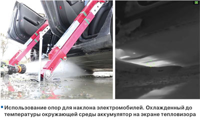 Чтобы выполнить проливку на электромобиле, у которого батарея расположена под днищем, требуется с помощью специальных опор наклонить и закрепить в таком состоянии машину. Так открывается доступ к аккумулятору – как для тушения, так и для контроля температуры батареи.