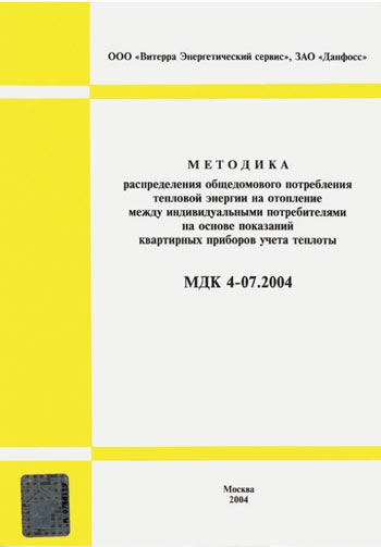 - МДК 4-07.2004 «Методика распределения общедомового потребления тепловой энергии на отопление между индивидуальными потребителями на основе показаний квартирных приборов учета теплоты». – М.: Госстрой РФ, 2004.