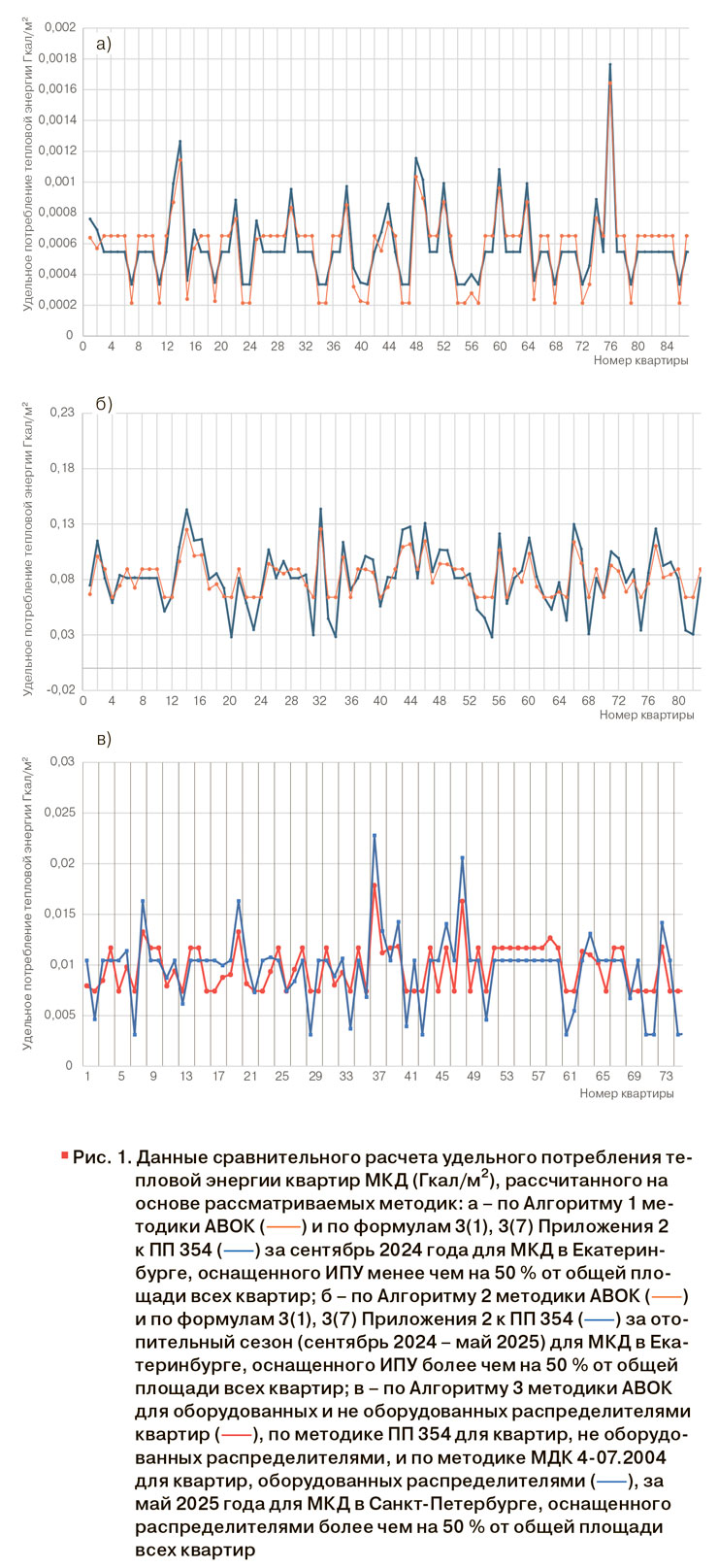 Результаты сравнительных расчетов по алгоритмам и формулам методик АВОК, ПП 354 и МДК, выполненных с использованием инструментов программного комплекса на основе реальных показаний СИУ в МКД, расположенных в Екатеринбурге и Санкт-Петербурге, представлены на рис. 1.