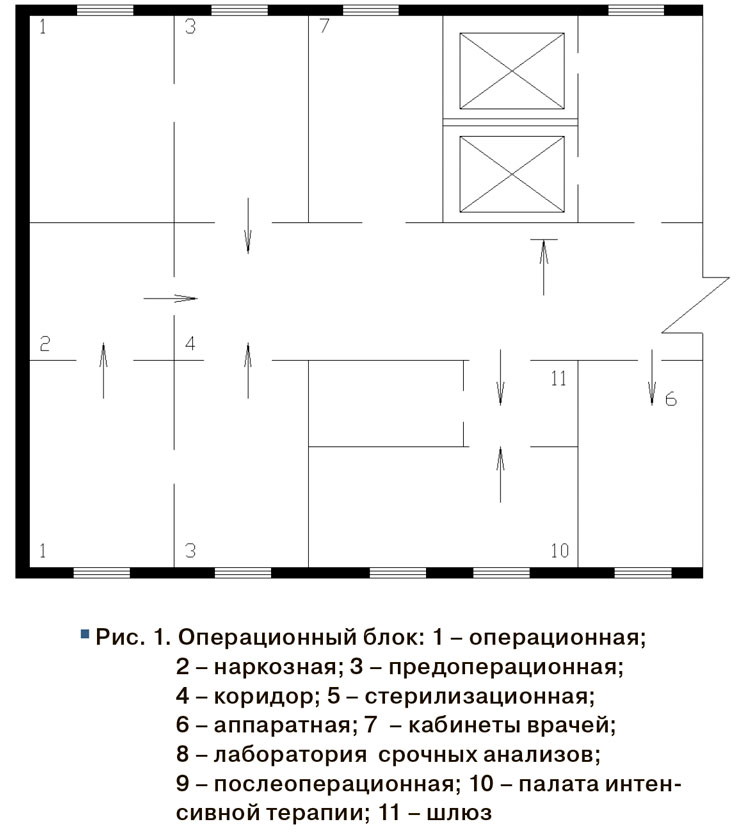 Управление потоками воздуха должно производиться за счет организации воздухообмена с применением дисбалансов воздуха. За счет работы систем вентиляции необходимо обеспечить зонирование здания на отдельные пространства с учетом различной степени чистоты (классов чистоты) помещений: от помещений операционных до коридоров и административно-бытовых помещений для исключения переноса загрязненного воздуха из «грязных» зон в «чистые». За счет применения дисбалансов воздуха возможна организация перепадов давления между помещениями для управления потоками перемещающегося воздуха. Например, в асептических операционных, родовых палатах следует создавать избыточное давление по отношению к смежным помещениям (предоперационной, наркозной и коридору и т. д.), чтобы обеспечить движение воздуха из операционной в прилегающие помещения по мере убывания асептических требований, а не наоборот. На рис. 1 представлено требуемое направление движения воздуха между помещениями операционного блока [9]. В связи с этим загрязненный воздух из смежных помещений не попадает в стерильное помещение операционной. В септической операционной – наоборот: из прилегающих помещений – в операционную.