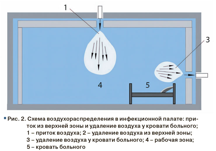 Важно правильно организовать раздачу воздуха в помещениях и его удаление. Задачей воздухораспределения является не только обеспечение подачи в помещения расчетного количества приточного воздуха, но и исключение образования застойных зон, в которых могут скапливаться загрязнения. Струя приточного воздуха не должна пересекать грязные зоны помещения, приток должен быть организован в чистую зону помещения, удаление – из наиболее грязной или у места образования вредностей. Например, в палате инфекционного бокса подачу воздуха рационально предусмотреть над головой больного, удаление инфицированного воздуха – у изголовья кровати через решетки, встроенные в стену (рис. 2) [5, 8]. При организации воздухораспределения требуется проведение точного расчета применяемого воздухораспределителя, позволяющего определить параметры струи, вытекающей из приточного отверстия. Необходимо проверять длину участка помещения, омываемого струей, значение температуры и скорости потока при входе в рабочую зону помещения на соответствие требуемым значениям.