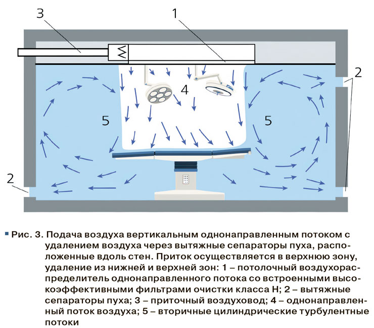 В помещении операционной приток воздуха организовывать над операционным столом, а удаление производить равномерно через решетки, размещенные у внутренних стен помещения (рис. 3).