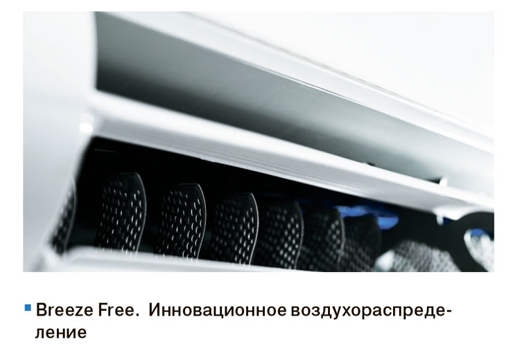 Благодаря сдвоенным независимым жалюзи в режиме охлаждения поток воздуха можно направить строго вдоль потолка, в режиме обогрева – вертикально вниз, вдоль стены.