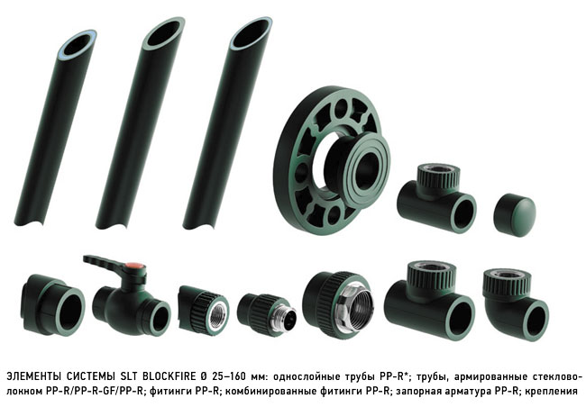 Для организации внутреннего противопожарного водопровода (ВПВ) используют трубы SLT BLOCKFIRE D = 90–160 мм; для построения рядков системы АУП – трубы SLT BLOCKFIRE D = 40–63 мм; для лучей АУП – трубопроводы SLT BLOCKFIRE D = 40–63 мм.