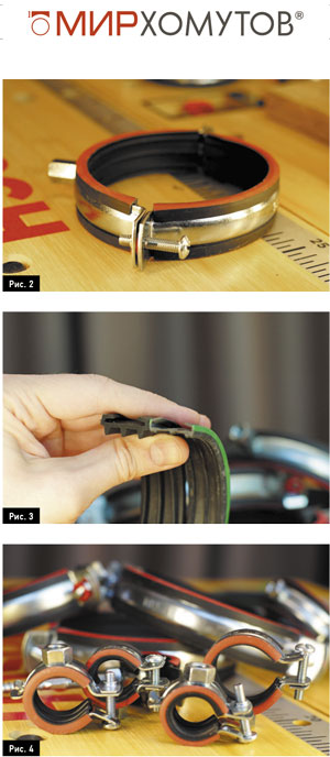 От уплотнителя зависят антивибрационные и антишумовые свойства. Хорошие хомуты имеют толстый уплотнитель из мягкой резины. Плохой крепеж комплектуется жестким и тонким уплотнителем, который потрескается в первые же годы эксплуатации на объекте.
