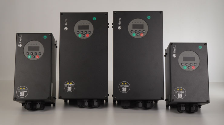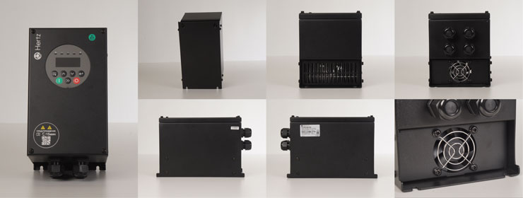 Номинальная мощность по-прежнему достигает 30 кВт с возможностью переключения на «нормальный» или «тяжелый» режимы. Компактность металлического корпуса Hertz IP55 в сравнении с аналогичными предложениями на рынке повышает шанс установки ПЧ в тяжелых условиях эксплуатации при отсутствии места для стандартных шкафов. Сальниковые вводы IP68 дополняют надежность стального корпуса.