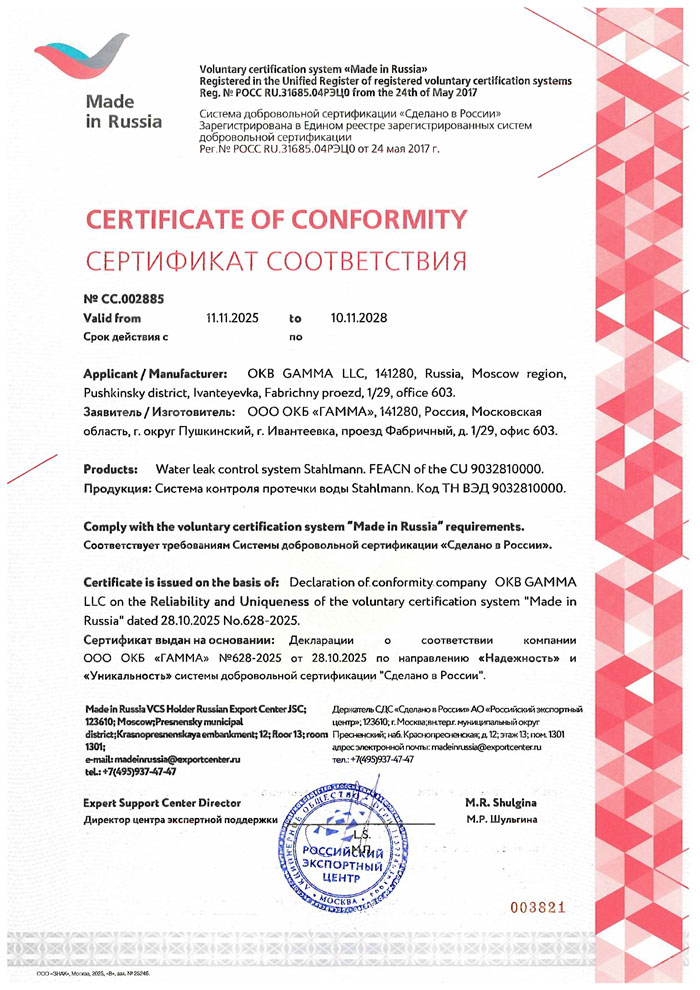 Получение сертификата «Сделано в России» укрепляет позиции торговой марки Stahlmann™ в статусе эталона надежности и уникальности на рынке защиты от протечек воды.