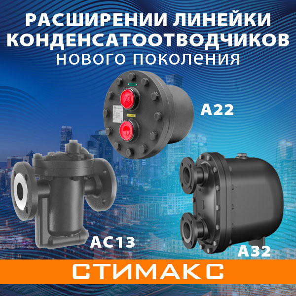 Также представляем Вашему вниманию запуск широкой линейки конденсатоотводчиков c перевернутым стаканом выполненных из углеродистой стали - Стимакс АС13, DN15-100, PN40, Tmax +300 0С, фланцевое присоединение. Модельный ряд разработан с фокусом на повышение энергоэффективности и надежности работы паровых систем промышленных предприятий.
