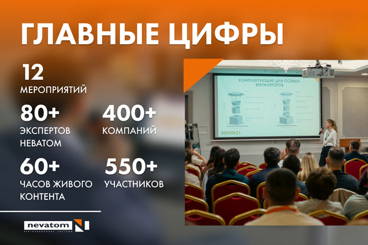 В течение года НЕВАТОМ провела 12 региональных конференций в различных городах России, а также 4-ю вентиляционную конференцию В3 в рамках Сибирской строительной недели. Участниками мероприятий стали сотни специалистов — проектировщиками, монтажниками, техническими специалистами и партнерами компании.