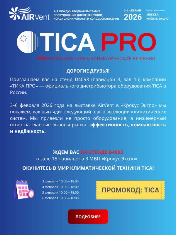 Компания «ТИКА ПРО», официальный дистрибьютор глобального производителя климатической техники TICA, примет участие в IV Международной выставке AirVent, которая пройдёт с 3 по 6 февраля 2026 года в МВЦ «Крокус Экспо». На стенде D4093 в павильоне 3 посетители увидят новые разработки бренда, направленные на повышение энергоэффективности и надёжности систем кондиционирования.